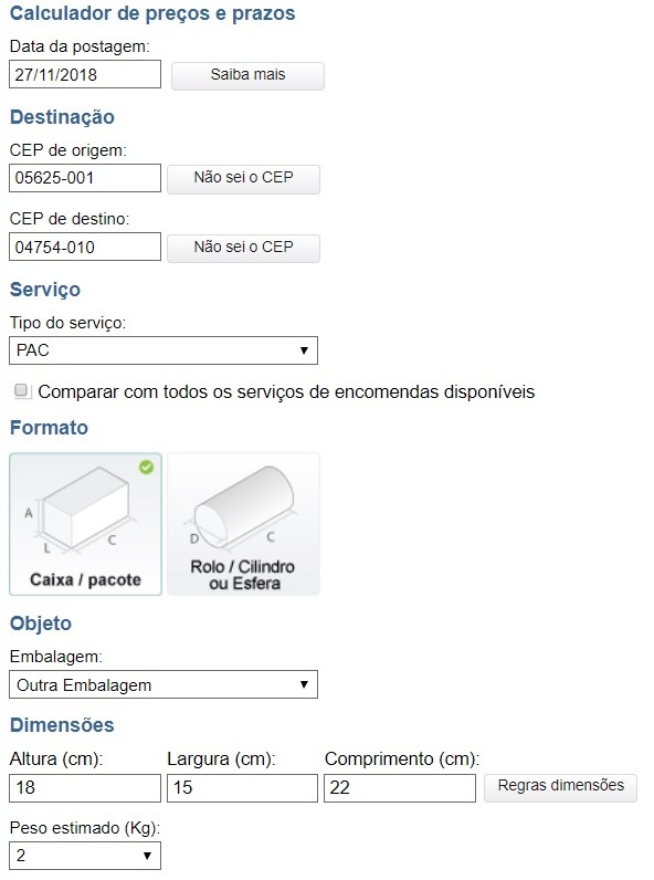 - Insira a data de postagem, os CEPs de origem e destino da encomenda e o tipo de serviço (PAC, SEDEX, entre outros).