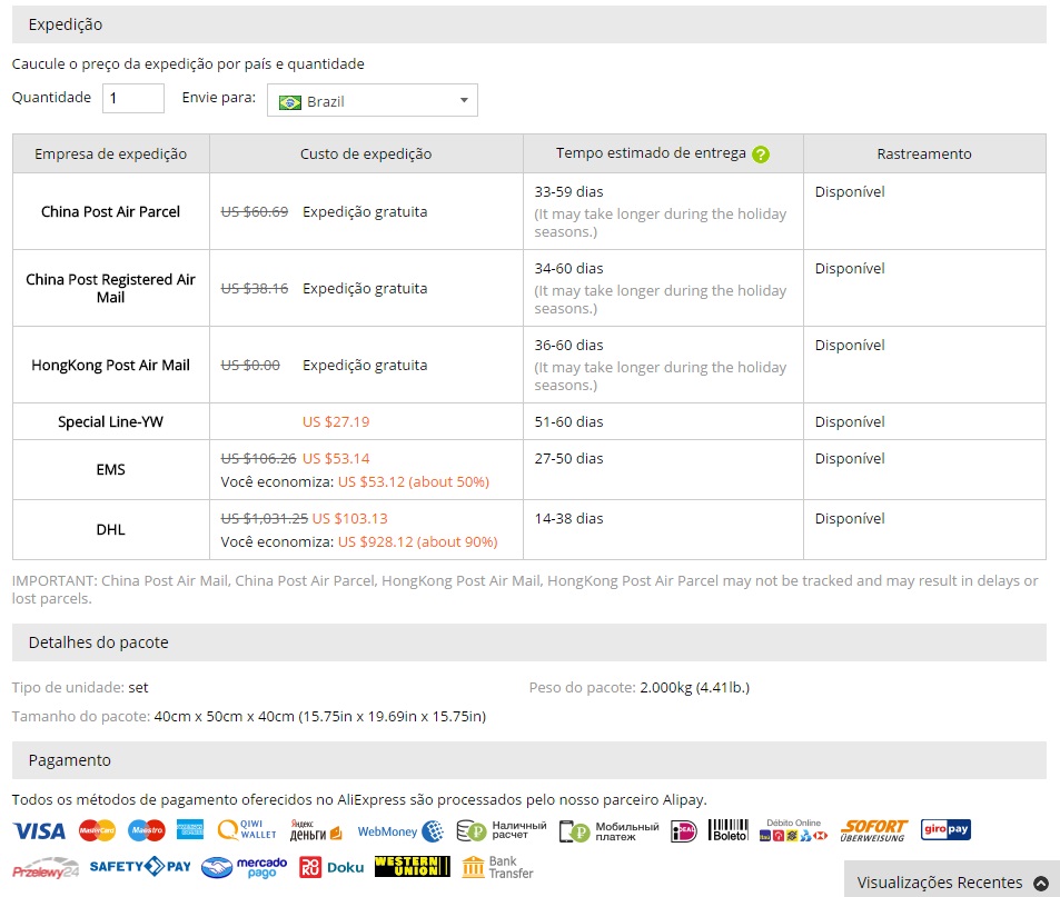 O AliExpress, por exemplo, oferece o pagamento via cartão de crédito, débito online, transferência bancária, entre muitas outras opções. Note também que o valor do produto é sinalizado em dólar, mas abaixo mostra aproximadamente quanto esse valor será em reais, de acordo com a taxa de câmbio vigente.
