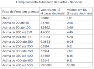O valor da carta e do aerograma nacional, para correspondências de até 20 gramas, passou a custar R$ 2,12. As cartas e cartões postais internacionais na modalidade econômica passaram a custar R$ 1,74. O telegrama nacional redigido na internet passa a ter um custo de R$ 8,90 por página.
