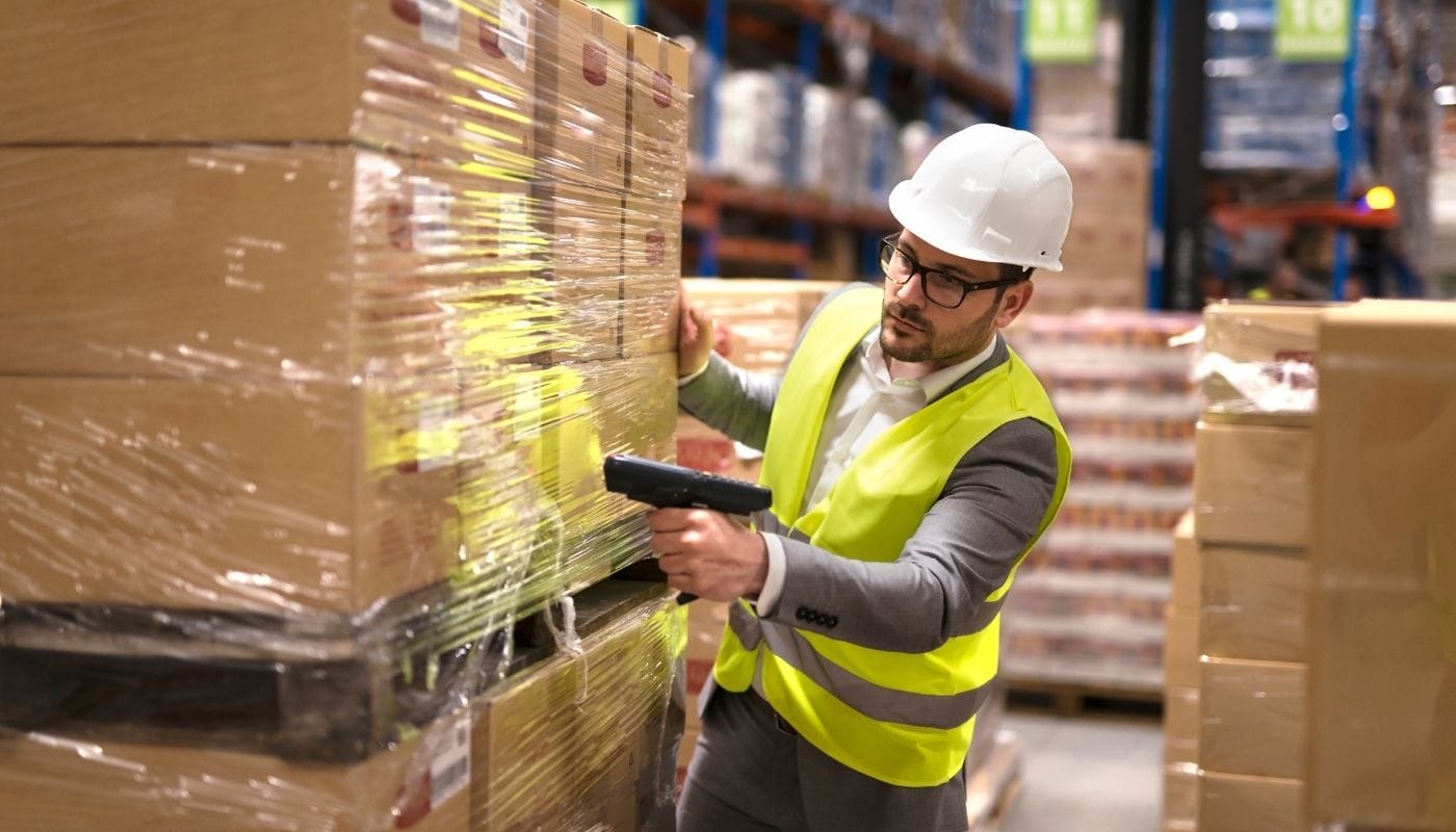 trabalhador de armazém usando leitor de código de barras para analisar mercadorias e fazer a gestão do supply chain