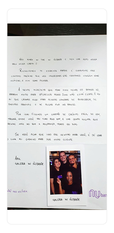 Escrever recados à mão estreita o relacionamento do seu negócio com o cliente, além de deixar a compra mais pessoal. O Nubank, por exemplo, é conhecido por essa prática: